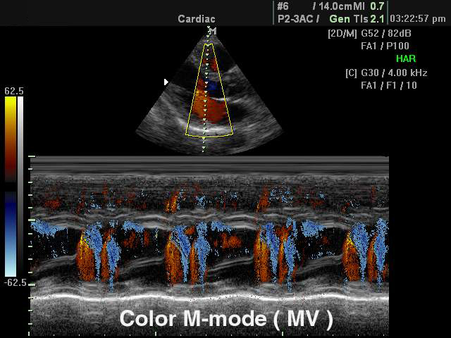 Цветной M-режим (Color M-mode) - это совмещение М-режима и режима ЦДК, при котором на графике М-режима цветокодированная составляющая изображения отображается в дополнение к серошкальной, что заметно упрощает временную оценку регургитации или рефлюкса.